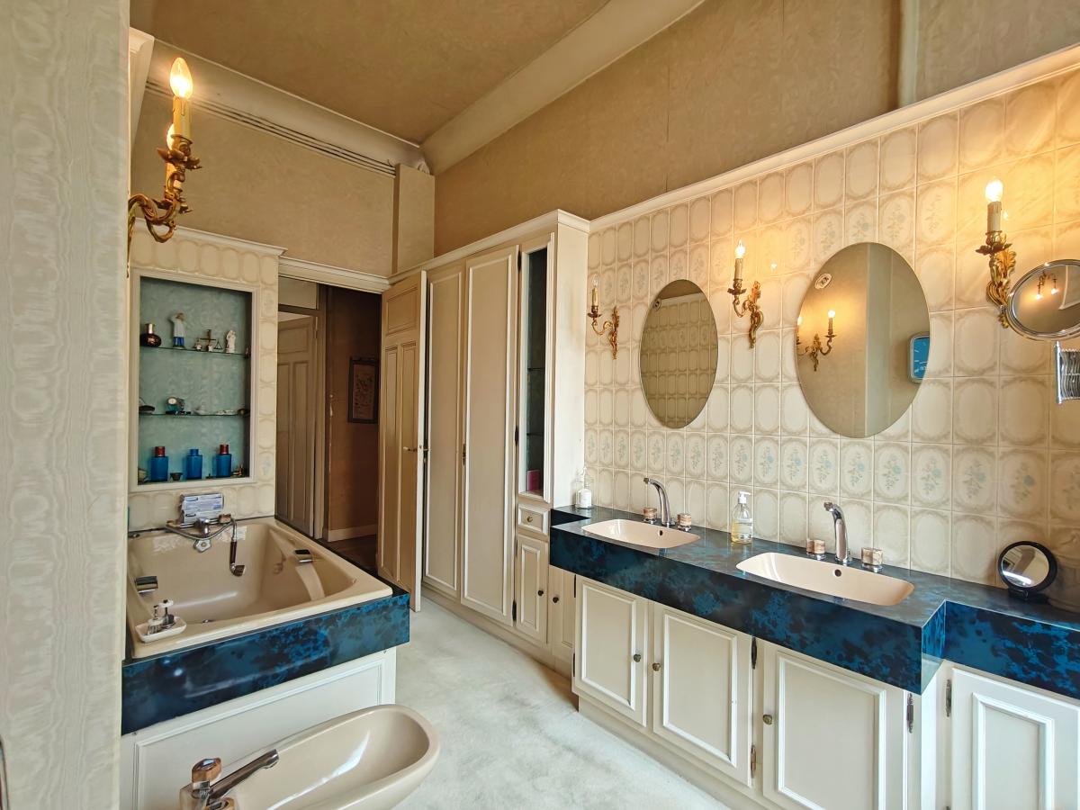 Entrée en étoile parquetée, cuisine, double séjour avec coin bureau et cheminée, vestibule, wc, salle de bains, trois chambres, salle de douches, dressing et bibliothèque