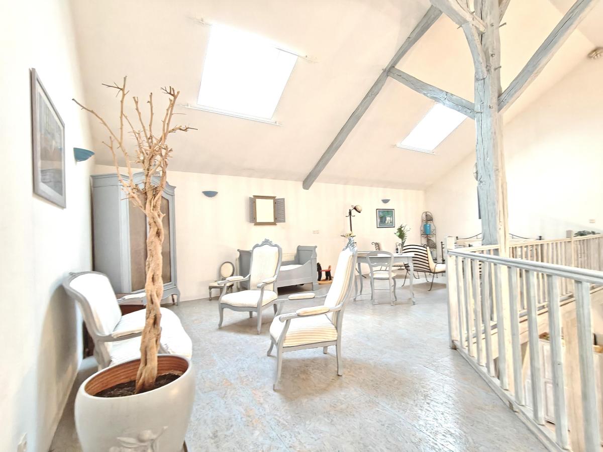 Au rdc : Entrée, salon - séjour cathédrale, salle de bains, bureau, wc, chaufferie, une chambre